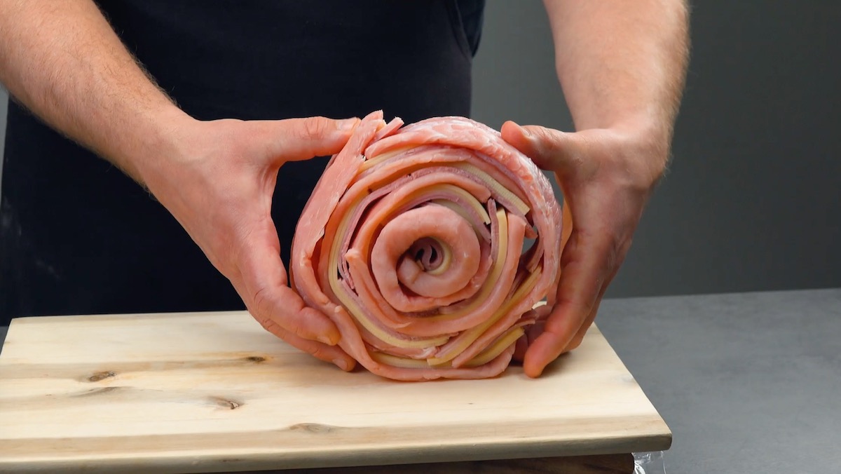 6. Ummantele die Fleischspirale mit rohem Schinken.