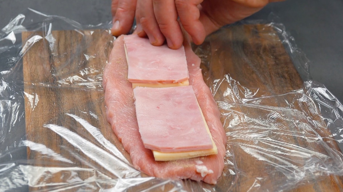 3. Bestreue die Fleischstücke mit Salz und Pfeffer und belege sie mit Käsescheiben und Kochschinken.