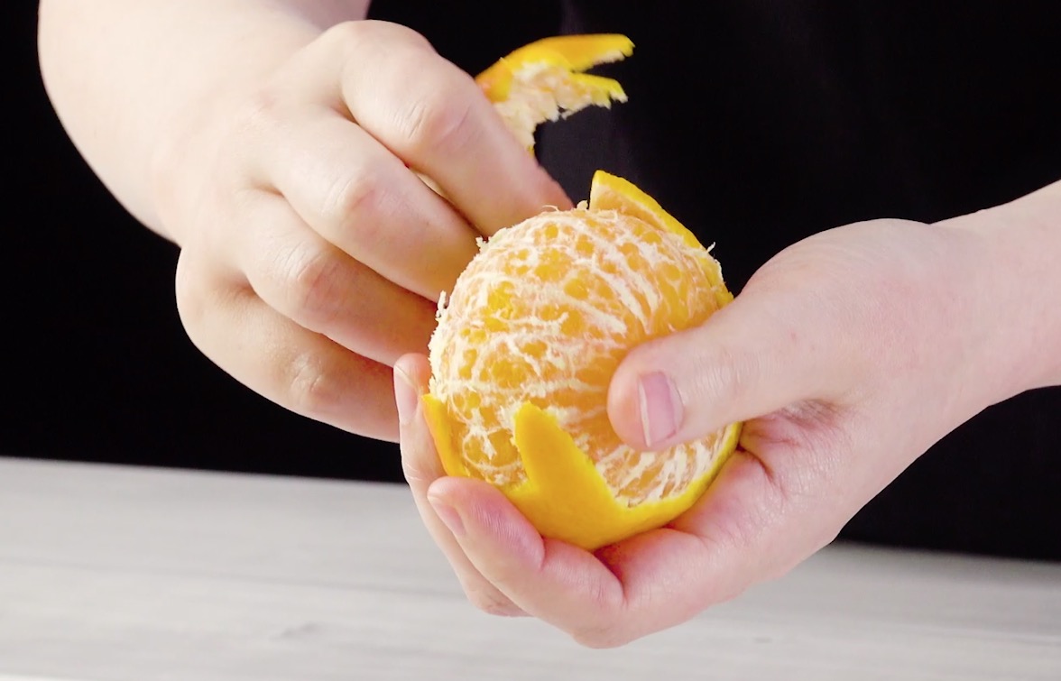 1.) Mache zuerst am „Deckel“ und am „Boden“ der Mandarine ringsherum einen Einschnitt und schnitze in den mittleren Ring der Schale Kopf und Schwanz der Schnecke. Nimm Deckel und Boden ab und entferne ebenso die Schale zwischen Kopf und Schwanz.