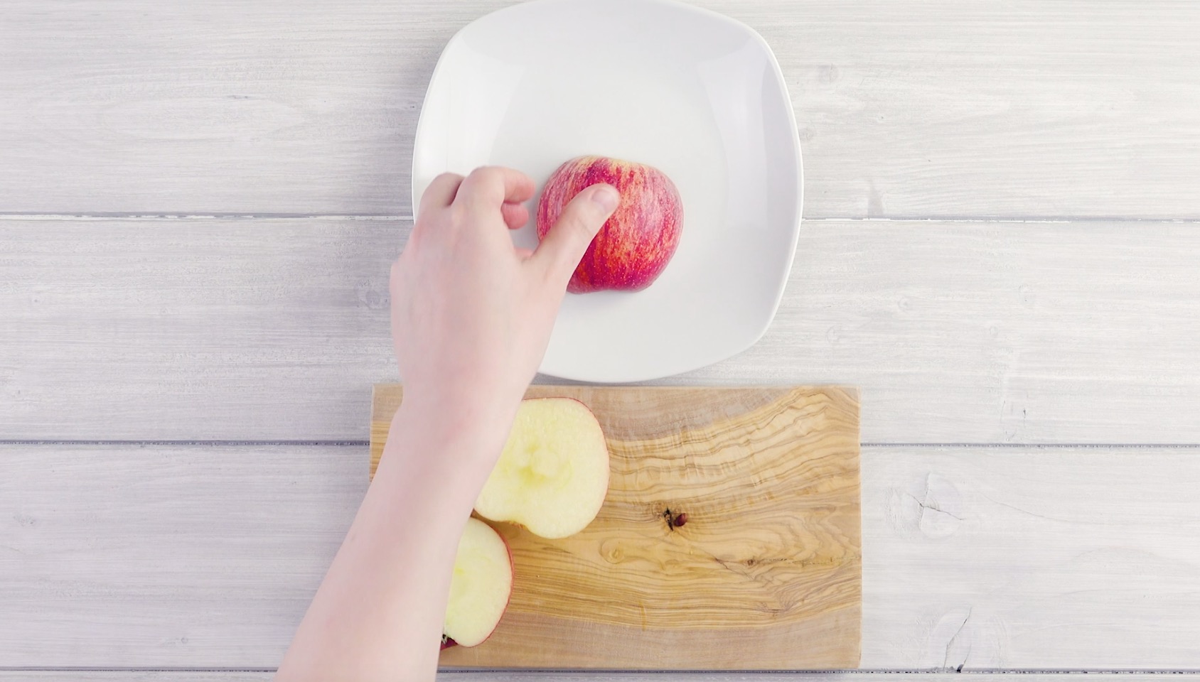 1.) Teile einen Apfel in drei Scheiben. Lege eine der Außenseiten mit der Schale nach oben auf einen Teller.