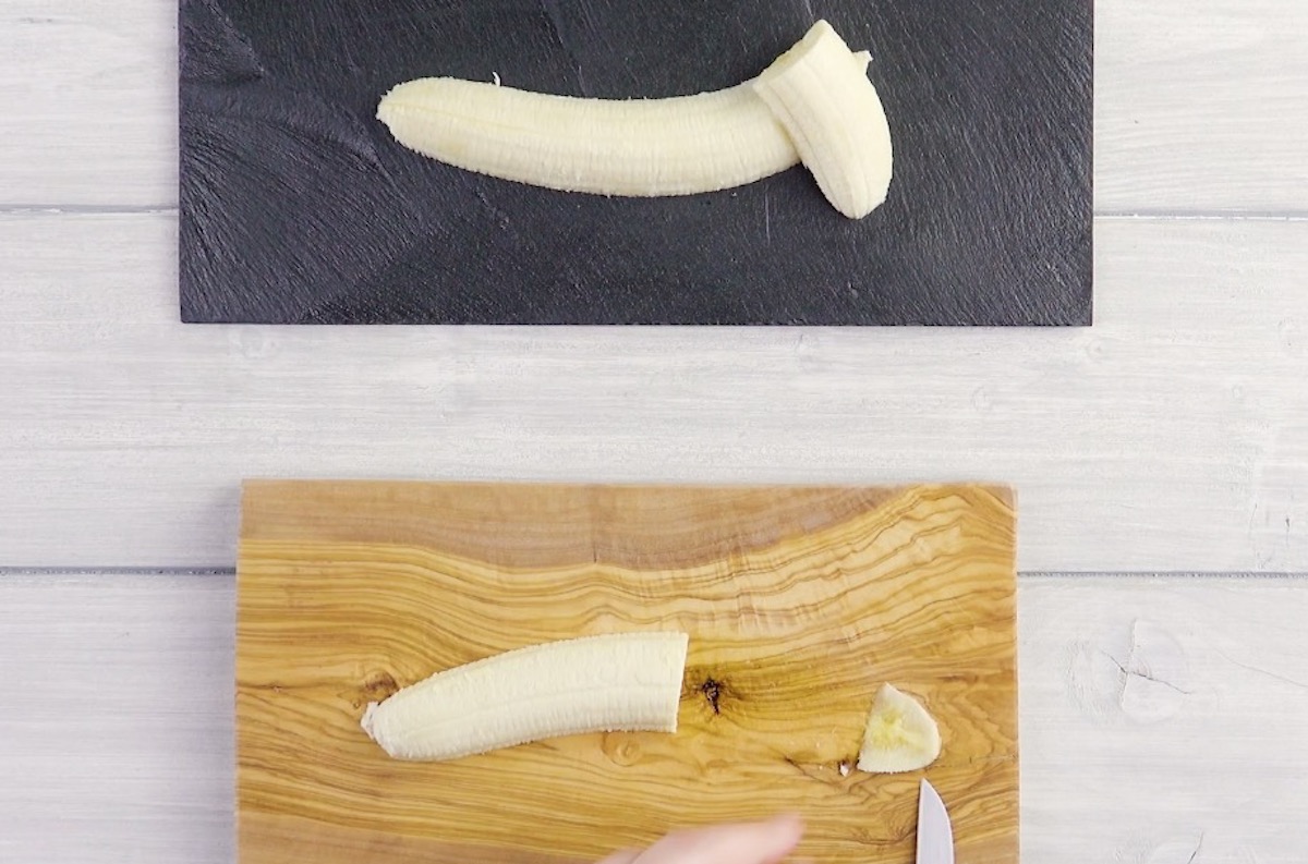1.) Halbiere zunächst eine Banane längs und kürze das Ende der einen Hälfte etwas. Vom Ende der anderen Bananenhälfte schneidest du ein etwas größeres Stück ab. Lege das abgeschnittene Bananenstück nun auf die erste Bananenhälfte.