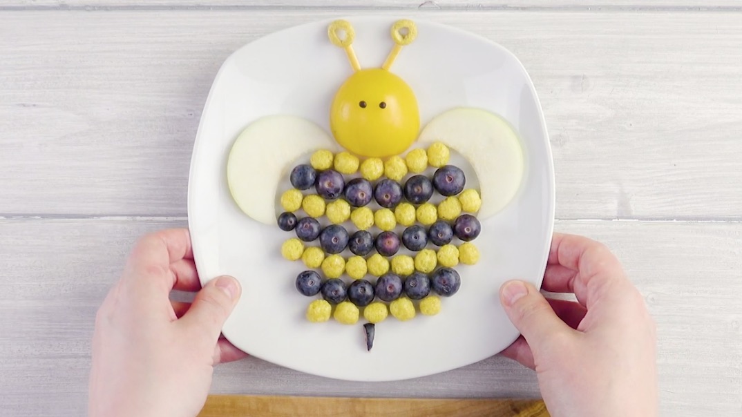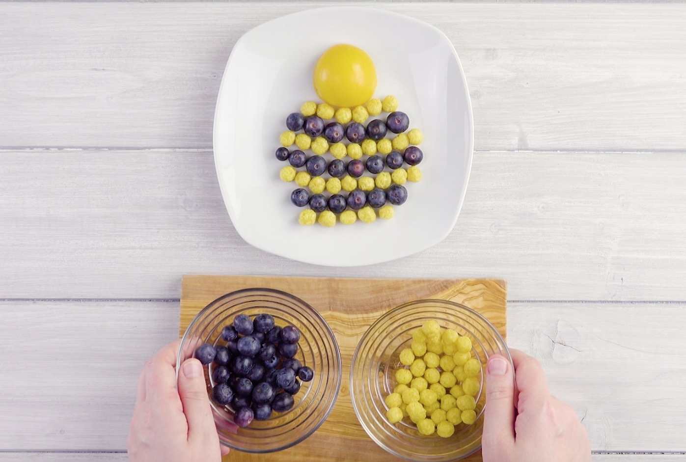 1.) Lege die Pflaumenhälfte auf einen Teller. Forme darunter mit Blaubeeren und „Honey Pops“ den gestreiften Bienenkörper.