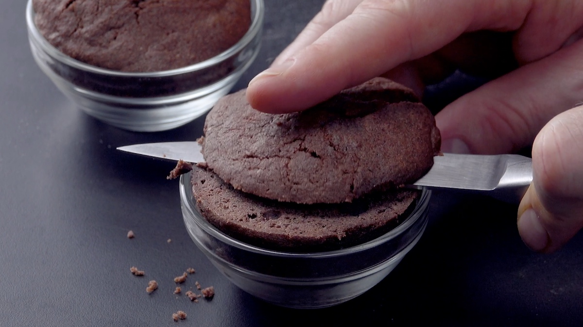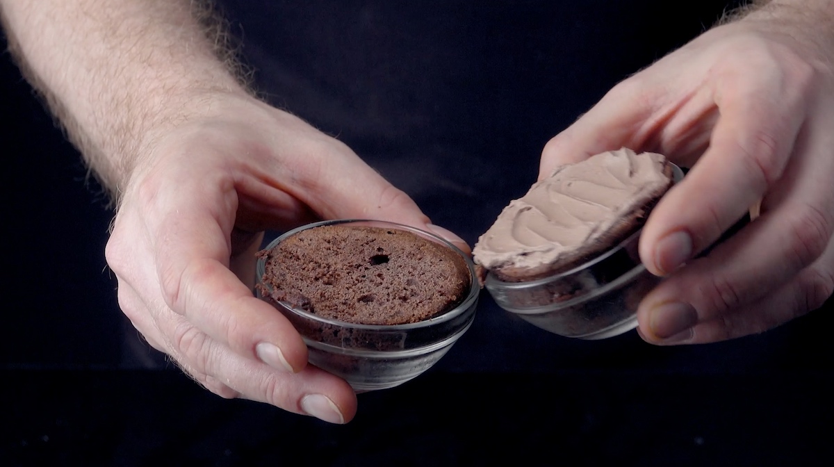 3.) Bestreiche nun je eine Hälfte der Kuchenpaare mit fertiger Schokobuttercreme, drücke dann die andere Hälfte vorsichtig obendrauf und entferne die obere Form.