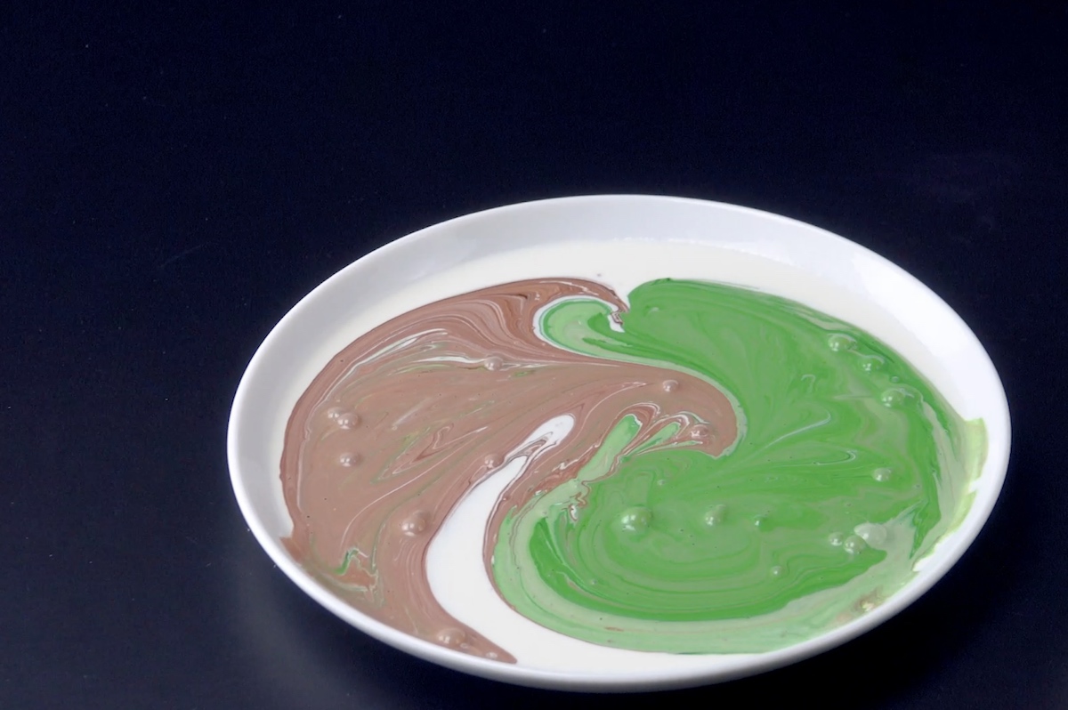 7.) Nun wird gefärbt: Träufle auf die eine Tellerhälfte etwas grüne und auf die andere etwas braune Lebensmittelfarbe und verrühre jede Farbe mit einem kleinen Löffel; achte jedoch darauf, dass sich die Farben nicht vermischen. Färbe die Glasur in der Schale blau.