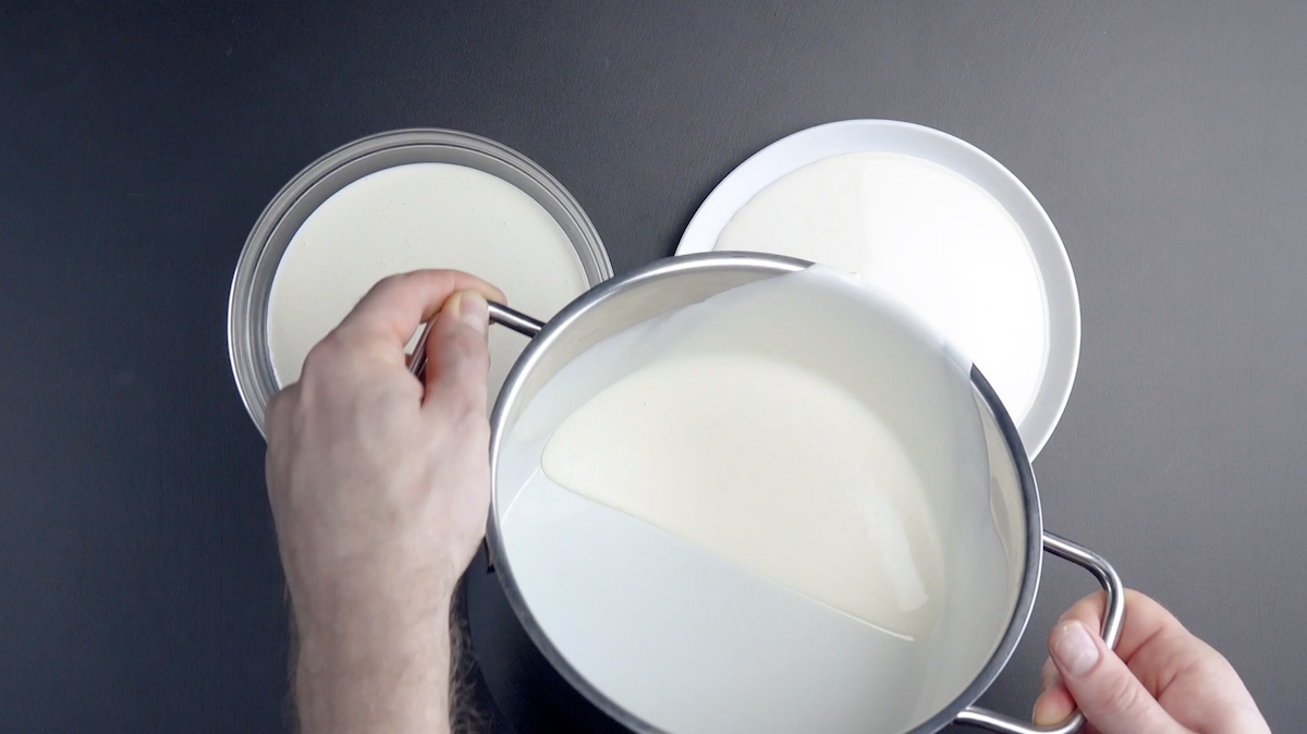 6.) Gib für die Glasur Zucker, Wasser und Kondensmilch in einen Topf und lass die Mischung unter ständigem Rühren mit einem Schneebesen aufkochen. Füge dann die Gelatine und die weiße Schokolade zu der nicht mehr kochenden Flüssigkeit hinzu und püriere alles sorgfältig mit einem Pürierstab. Fülle den Großteil der Glasur anschließend in eine Schale und verteile den Rest auf einen Teller.