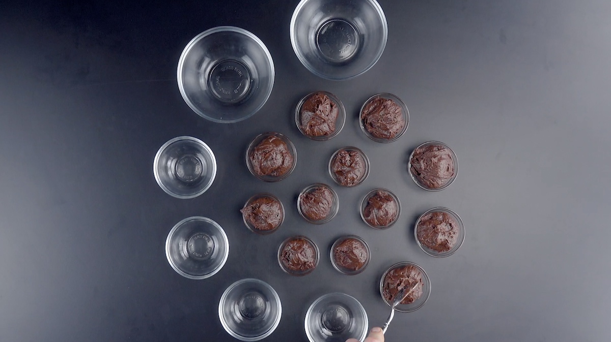 1.) Gib alle Zutaten für den Kuchen in eine große Schüssel und verrühre sie zu einer cremigen Masse. Verteile den Teig dann in unterschiedlich große Schalenpaare und backe sie für 30 Minuten bei 170 °C im Umluft-Modus.