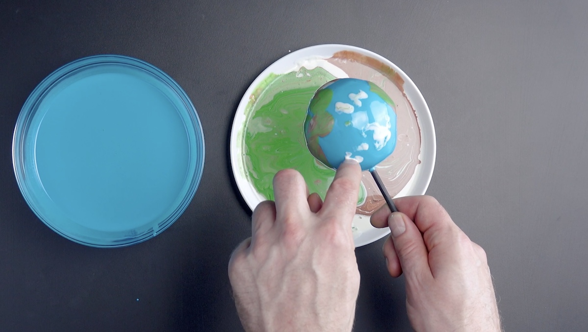 Der so entstandene Kuchenball erinnert doch stark an unsere Erde, oder? Alternativ kannst du natürlich andere Farben wählen und andere Planeten unseres Sonnensystems backen oder dir ganz neue Himmelskörper ausdenken – der Fantasie sind wie immer keine Grenzen gesetzt.
