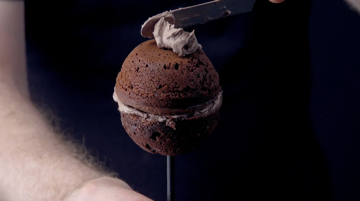 5.) Bestreiche nun den kompletten Kuchenball mit Schokobuttercreme.