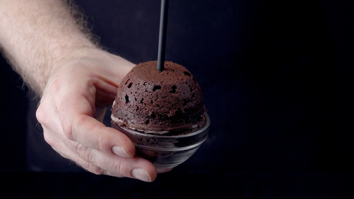 4.) Stich nun behutsam von oben einen Stab in den Kuchenball hinein, drehe das Ganze um und entferne auch die zweite Schale.