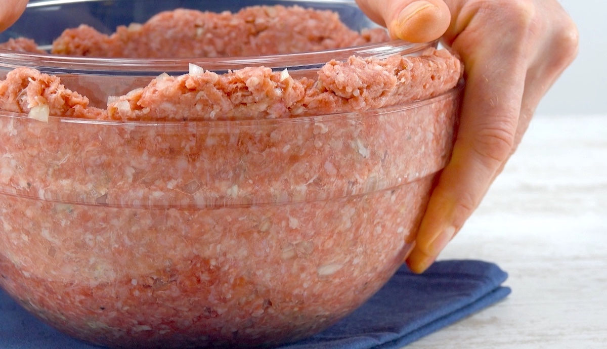 2. Vermische für die Hackfleisch-Schale zunächst alle Zutaten in der größeren Schüssel miteinander. Drücke dann die kleinere Schale in die größere, sodass sich das Hackfleisch dadurch selbst zu einer Schale formt.
