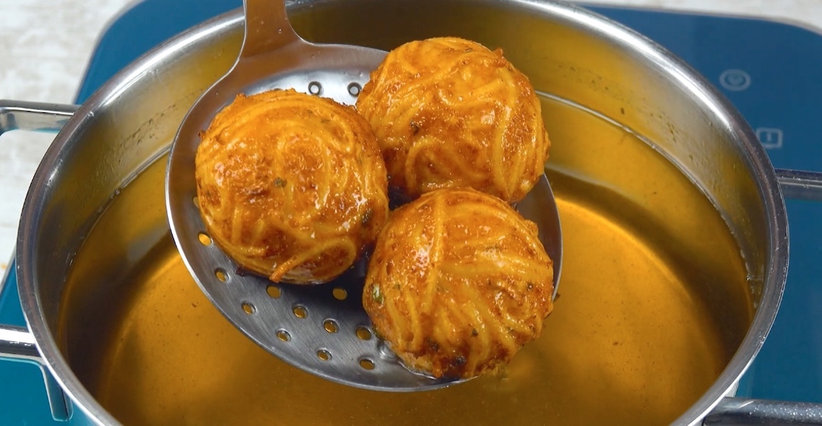 5. Frittiere dann die Spaghetti-Bälle für 5-10 Minuten, bis sie goldgelb sind.