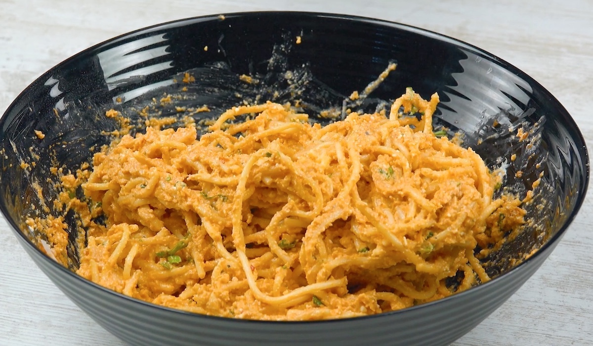 1. Koche die Spaghetti wie gewohnt, schrecke sie jedoch nicht mit Salzwasser ab, damit sie schön klebrig bleiben. Lass die Spaghetti etwas abkühlen und vermische sie dann mit Ricotta, Parmesan, Eiern, Basilikum, Semmelbrösel und Tomatensoße und schmecke mit Salz und Pfeffer ab. Lass die Mischung dann 20 Minuten ziehen.
