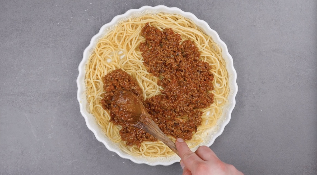 4.) Gib etwa ein Drittel der Spaghetti in die große Tarteform und verteile die Bolognese darauf; lass dabei einen Rand von ca. 1 bis 2 Zentimetern.