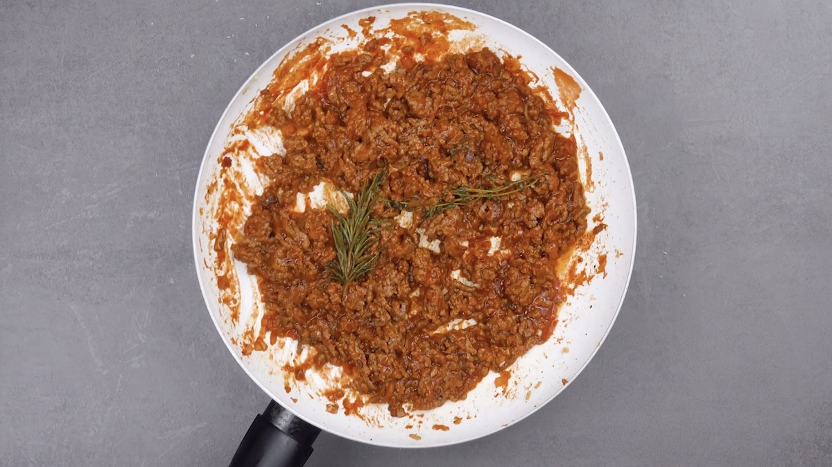 3.) Brate für die Bolognese Hackfleisch mit Zwiebeln und Knoblauch in Öl an. Gib passierte Tomaten hinzu, würze die Bolognese mit Salz und Pfeffer und lasse sie zusammen mit Rosmarin und Thymian kurz köcheln.