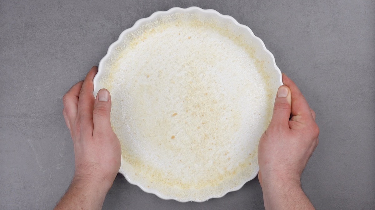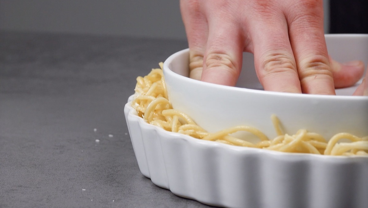 So geht es: 1.) Koche die Spaghetti in Salzwasser, gieße sie ab und lasse sie abkühlen. Fette die größere Tarteform mit Öl ein und verteile darin das Paniermehl.