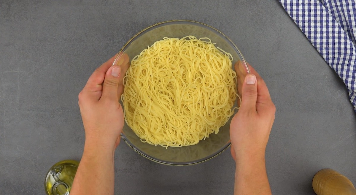 1.1) Koche die Nudeln und gieße sie ab. Lasse sie etwas abkühlen und gib sie dann in eine Schüssel.