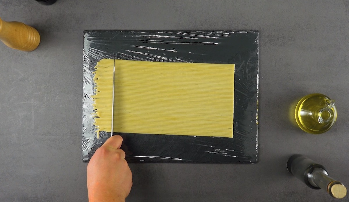 2.2) Schneide die Nudeln an beiden Enden gerade ab, sodass du einen rechteckigen „Nudelteppich“ vor dir liegen hast.