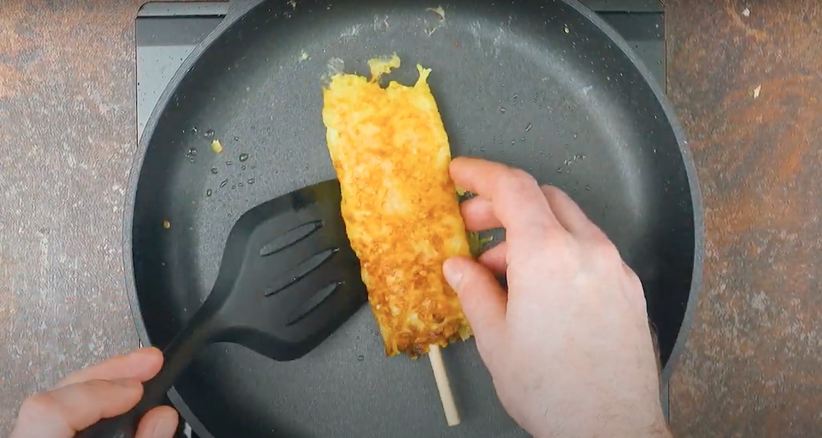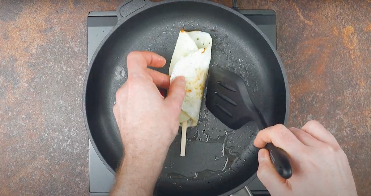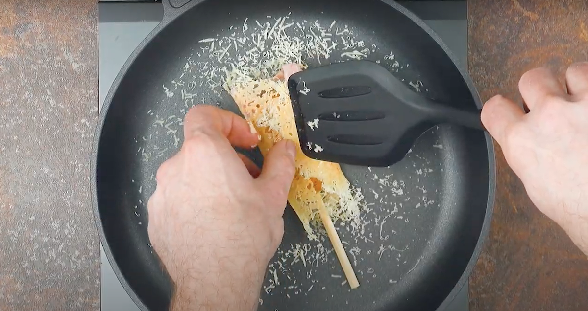 3.3 Lass das Ganze bei geringer Hitze braten und schmecke den Parmesan-Schinken-Spieß mit Pfeffer ab. Klappe dann vorsichtig den überstehenden Parmesan zur Mitte hin ein und wende den Spieß, sodass alle Seiten schön angebraten werden.