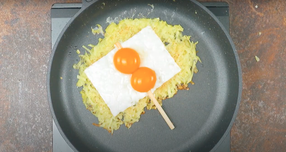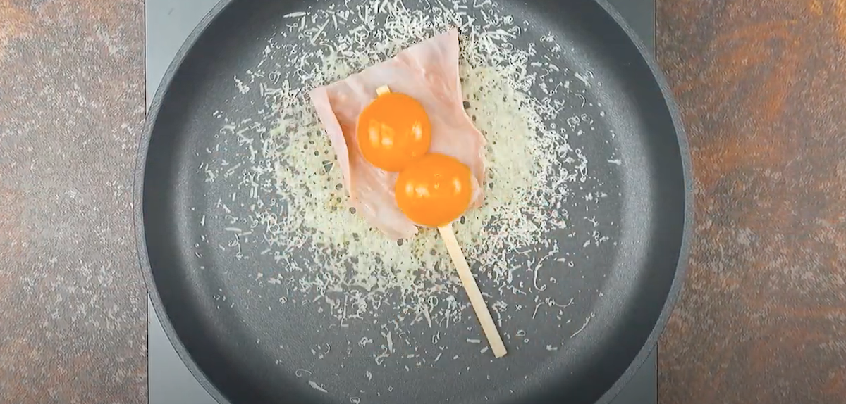 3.2 Lege eine Scheibe Kochschinken auf den geschmolzenen Parmesan, platziere einen Holzspieß auf dem Kochschinken und gib anschließend mit Vorsicht die 2 Eigelbe auf das obere Ende des Holzspießes.