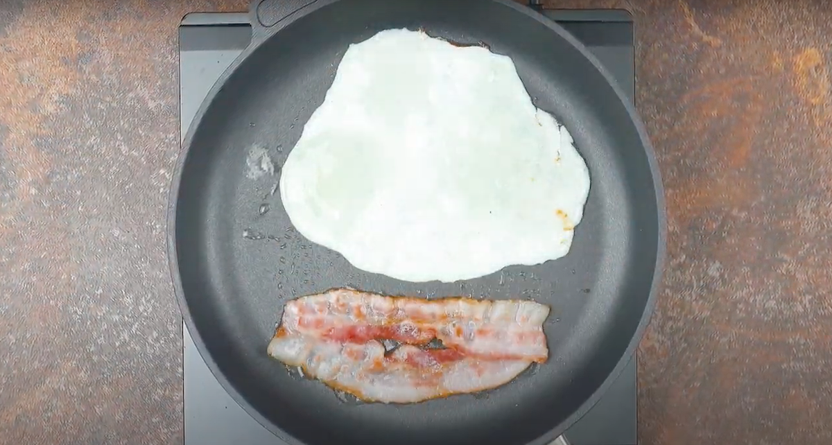 1.1 Lege die 2 Streifen Bacon in die Pfanne und brate sie von beiden Seiten an, aber lass sie nicht zu knusprig werden. Verschiebe sie dann in den unteren Teil der Pfanne. Trenne das Eigelb vom Eiweiß, gieße das Eiweiß in die obere Hälfte der Pfanne und lass es kurz anbraten.