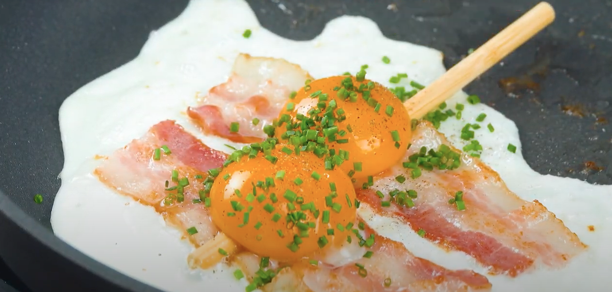 1.2 Lege den Bacon mittig auf das Eiweiß, platziere den Holzspieß mittig darauf und lass die Eigelbe vorsichtig auf den Holzspieß gleiten. Pfeffere das Ganze und bestreue es mit dem geschnittenen Schnittlauch.