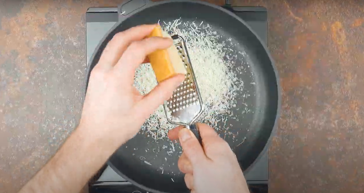3.1 Verwende auch hier am besten eine Antihaft-Pfanne und wärme diese leicht vor. Reibe den Parmesan auf die obere Hälfte der Pfanne und lass ihn schmelzen.