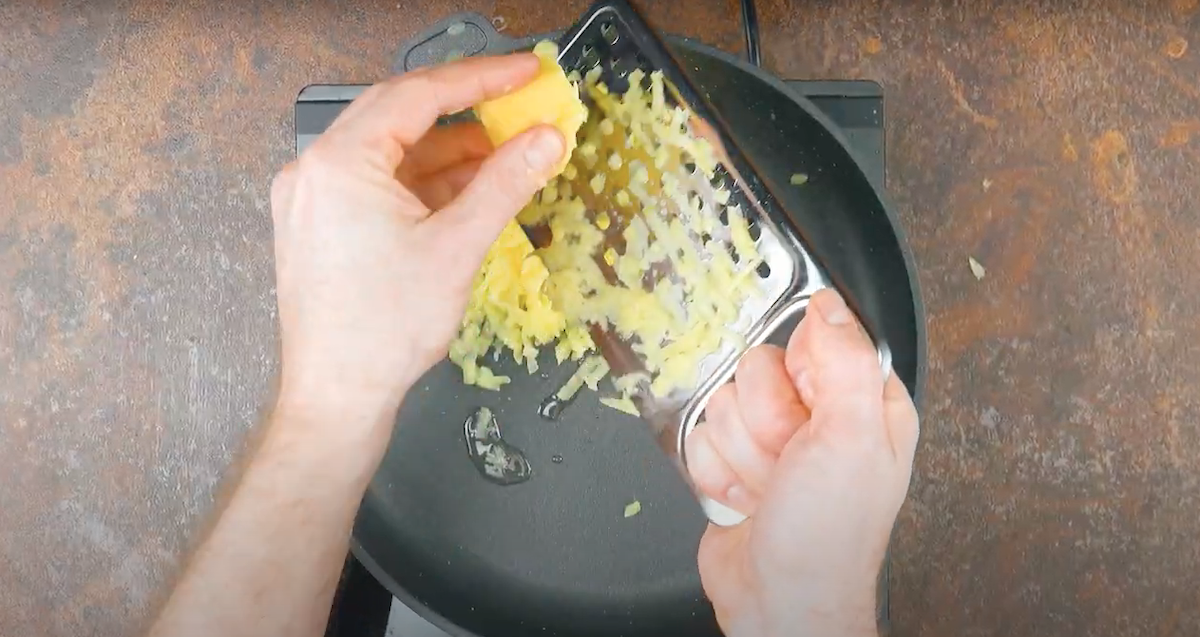 2.1 Wärme die Pfanne leicht vor. Reibe die Kartoffel mit einer groben Reibe in den oberen Teil der Pfanne, schmecke sie mit Salz, Pfeffer und Muskatnuss ab und verstreiche die Masse so, dass sie nicht zu dick ist.