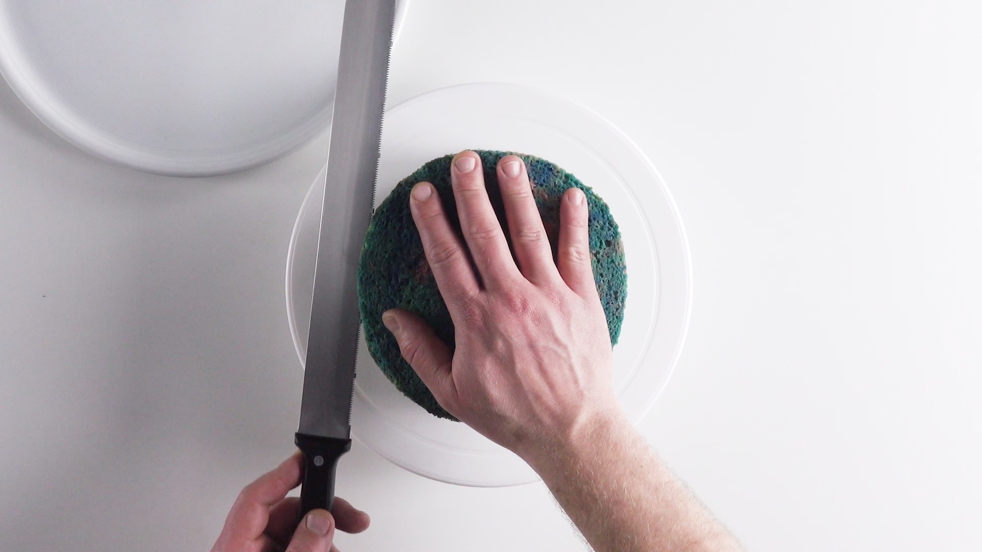 4.) Backe den Teig dann für 50 Minuten bei 175 °C im Umluft-Modus. Nachdem der Teig ausgekühlt ist, schneidest du ihn horizontal in 3 gleich dicke Platten.
