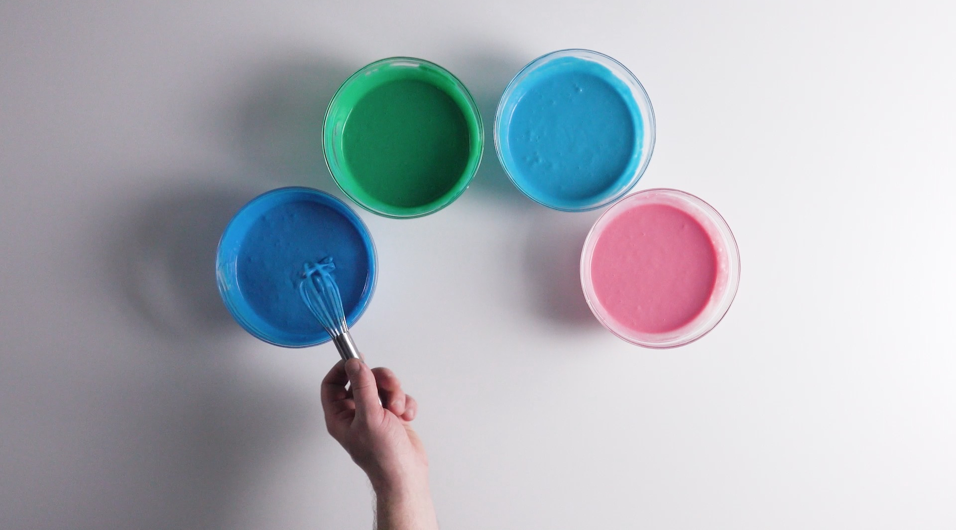 2.) In jeden Teigteil wird anschließend eine andere der unterschiedlichen Lebensmittelfarben eingerührt. Die blaue Farbe kannst du zweimal verwenden und in eine Schüssel ein paar Tropfen mehr davon geben.