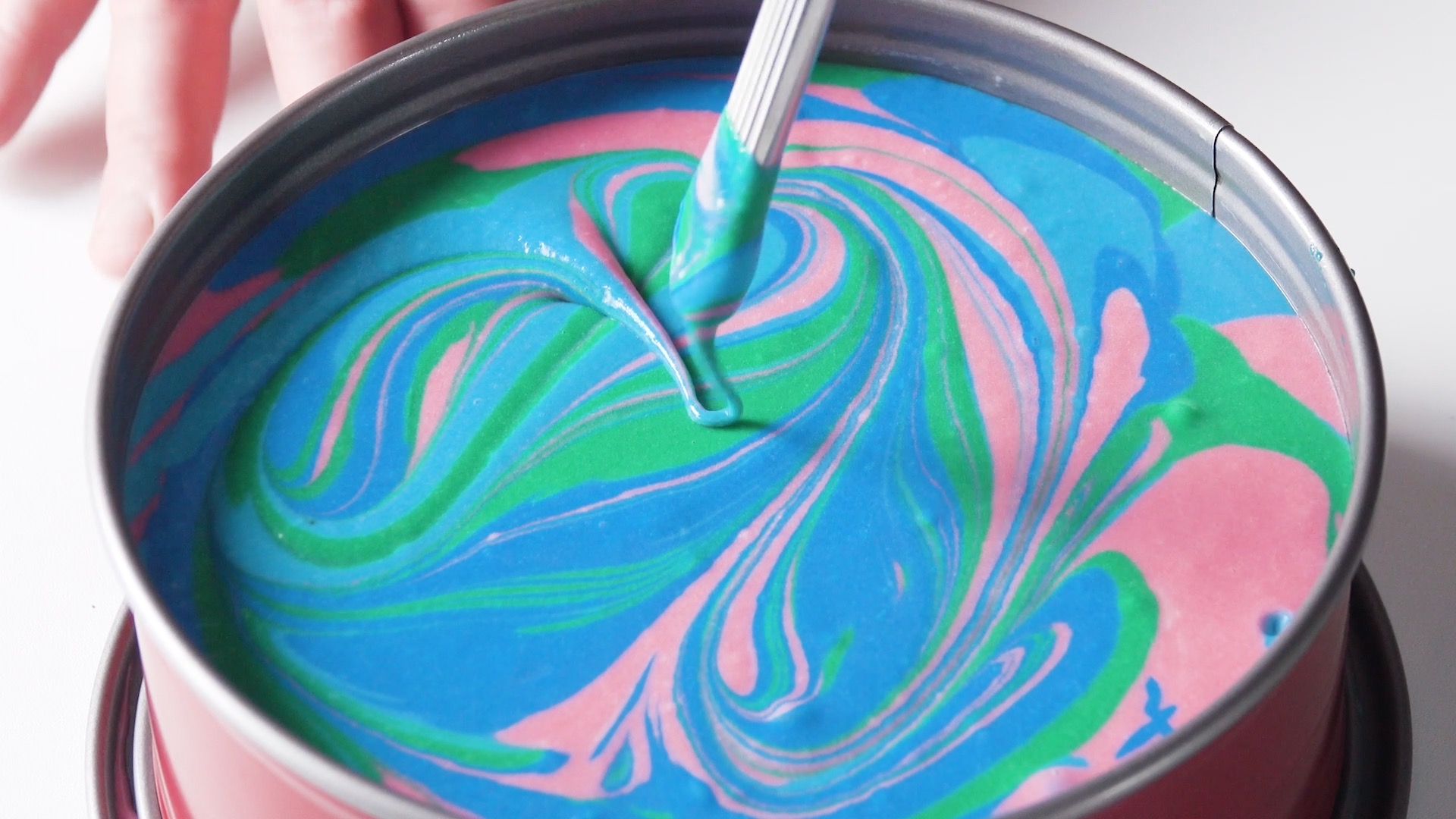 3.) Vermische die Farbe dann folgendermaßen in einer gefetteten Springform: Gib immer abwechselnd einen Esslöffel einer Farbe hinein, sodass sich die 4 möglichst gut vermischen. Zum Schluss kannst du zu diesem Zweck noch zusätzlich mit einem Löffelstiel Bahnen durch den bunten Teig ziehen.