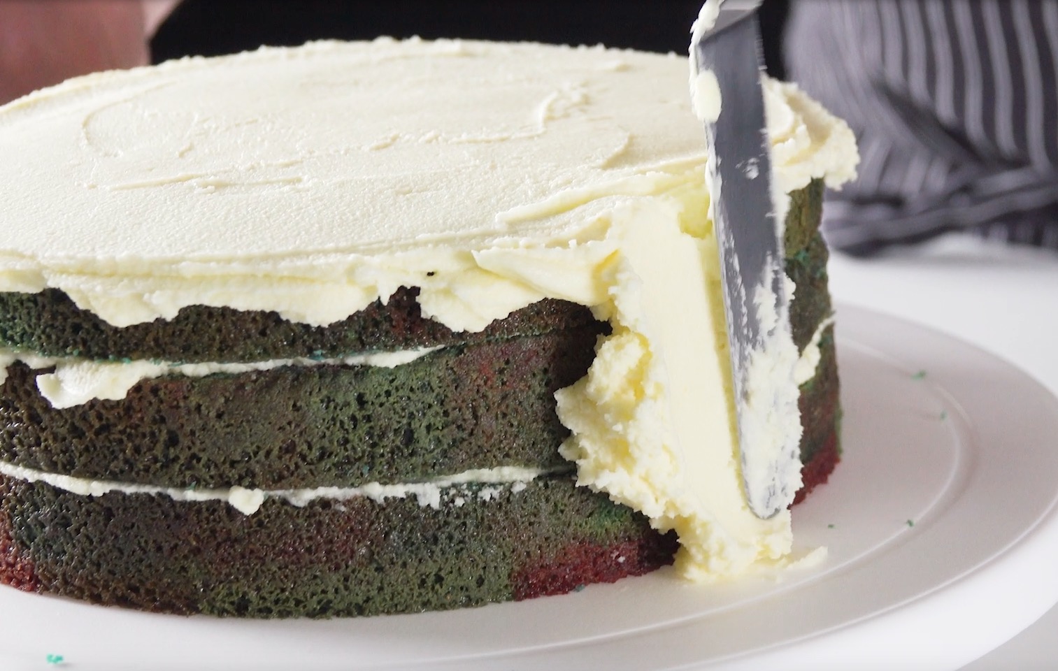 Mit dem Rest der Buttercreme bestreichst du den Kuchen komplett und stellst ihn dann für 30 Minuten kalt.
