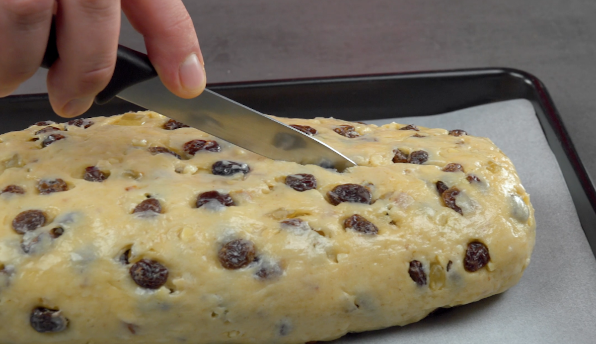 6.) Lege den Teigstollen auf ein mit Backpapier ausgelegtes Backblech, bestreiche ihn mit kaltem Wasser, ritze ihn in der Mitte längs mit einem Messer ein und schiebe das Blech für 60 Minuten in den Ofen. Drehe die Gradzahl auf 170 °C herunter. Achte darauf, dass der Stollen nicht zu dunkel wird, sonst wird er zu trocken. Ist er zu hell, kann es sein, dass er innen noch nicht richtig durch ist.