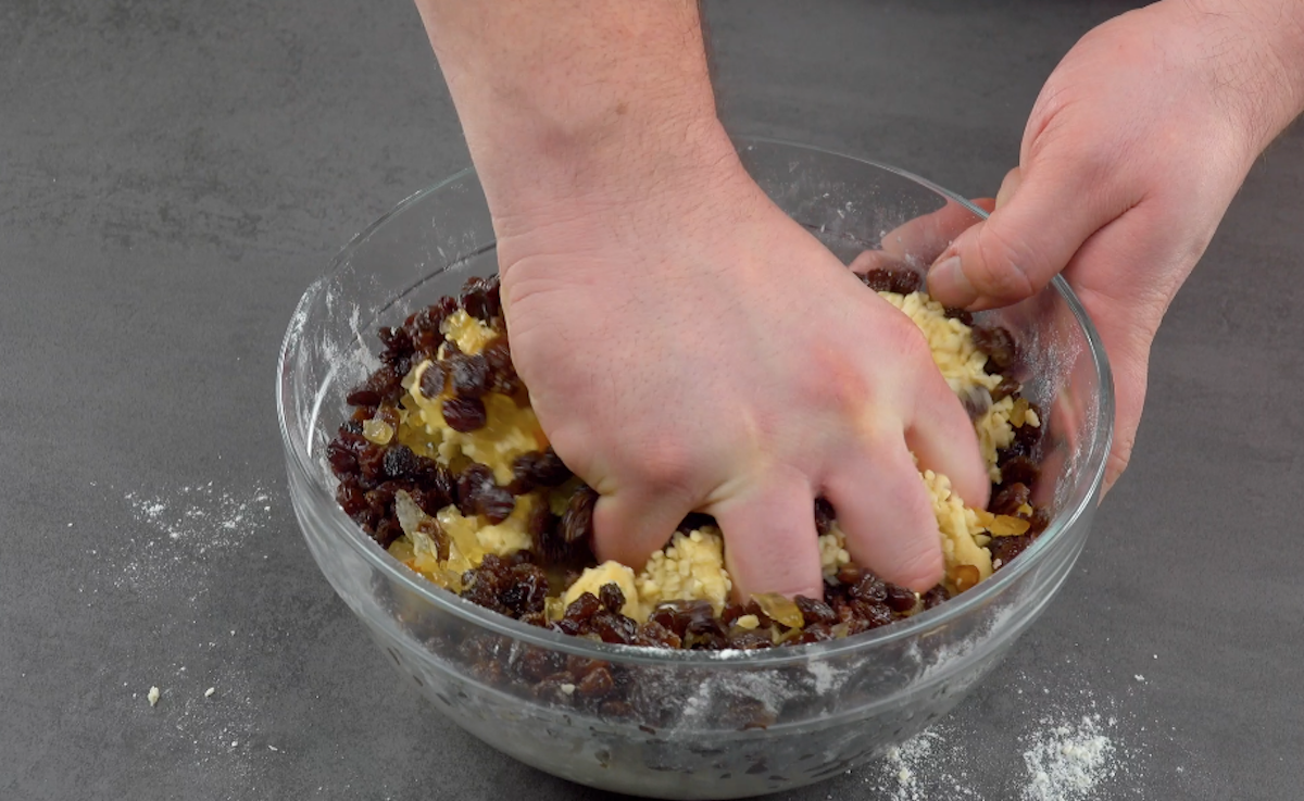 4.) Gib jetzt gehackte Mandeln, kandierte Orangen- und Zitronenschalen und die Rosinen in den Teig und knete sie unter. Jetzt kannst du den Ofen schon einmal auf 180 bis 200 °C Ober- und Unterhitze vorheizen.