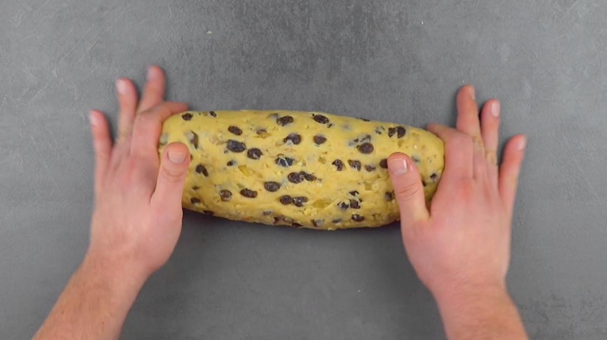 5.) Forme nun mit deinen Händen den Stollen in seine typische Form. Sollte der Teig durch die Rum-Rosinen zu feucht geworden sein, kannst du ruhig noch etwas Mehl hinzugeben.