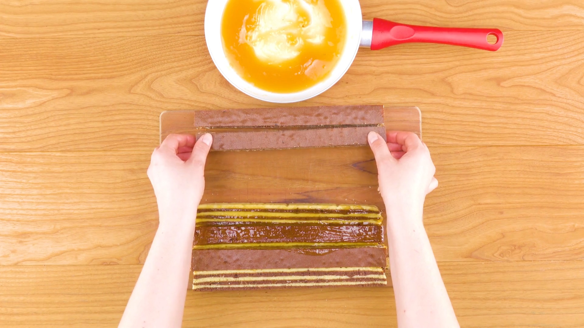 6.) Erwärme das Aprikosengelee, um es zu verflüssigen, und streiche damit großzügig die Streifen ein. Setze nun je vier Streifen in zwei Reihen übereinander zu einem Kastenkuchen zusammen. Streiche alle Seiten, die sich berühren, gut mit Gelee ein. So kleben sie zusammen und bleiben in Form.