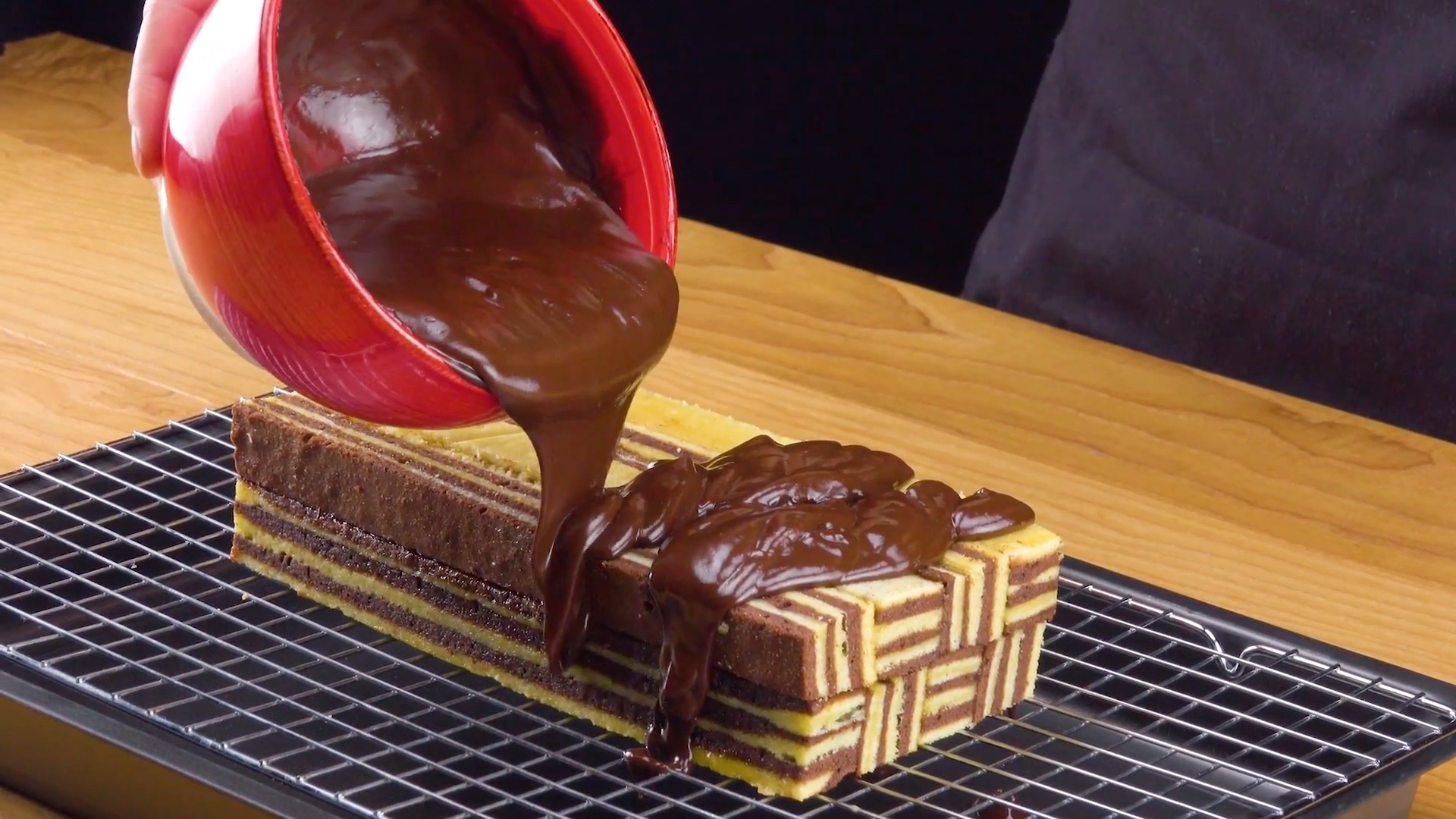 7.) Um die Kuchen-Ganache zuzubereiten, koche Schlagsahne auf, nimm sie von der Kochstelle und füge dann die zerkleinerte Kuvertüre hinzu. Löse die Schokolade unter Rühren auf und füge erst zum Schluss die Butter hinzu. Setze den Streifenkuchen nun auf ein Kuchengitter und lass die Ganache auf ihn laufen. Achte darauf, den Kuchen vollständig einzudecken, und streiche die Ganache bei Bedarf mit einem Teigschaber glatt.