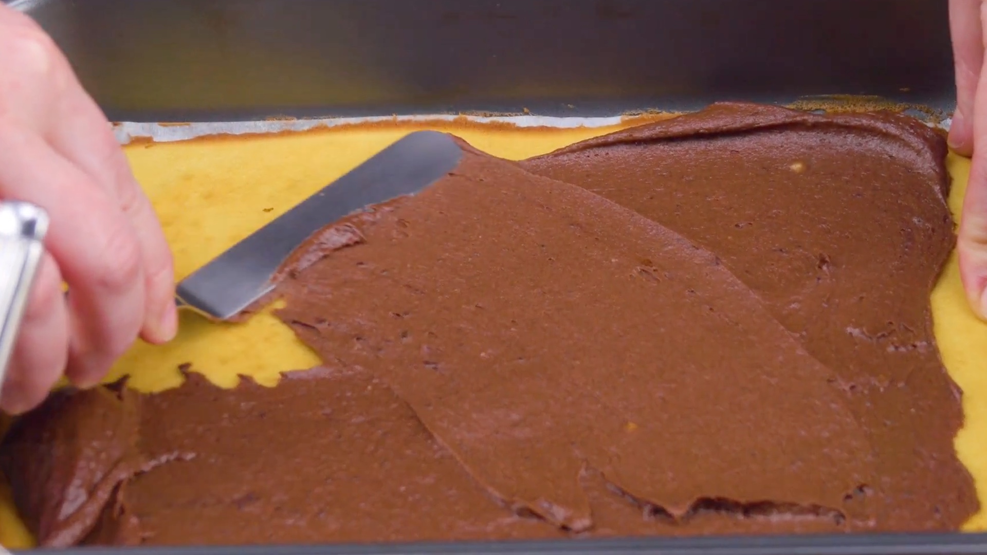 4.) Jetzt streichst du eine Schicht dunklen Teig auf und backst den Kuchen erneut nur drei Minuten. Wie beim Baumkuchen wird auch dieser Kuchen mit jeder zusätzlichen Schicht ein weiteres Mal, aber nur sehr kurz gebacken.