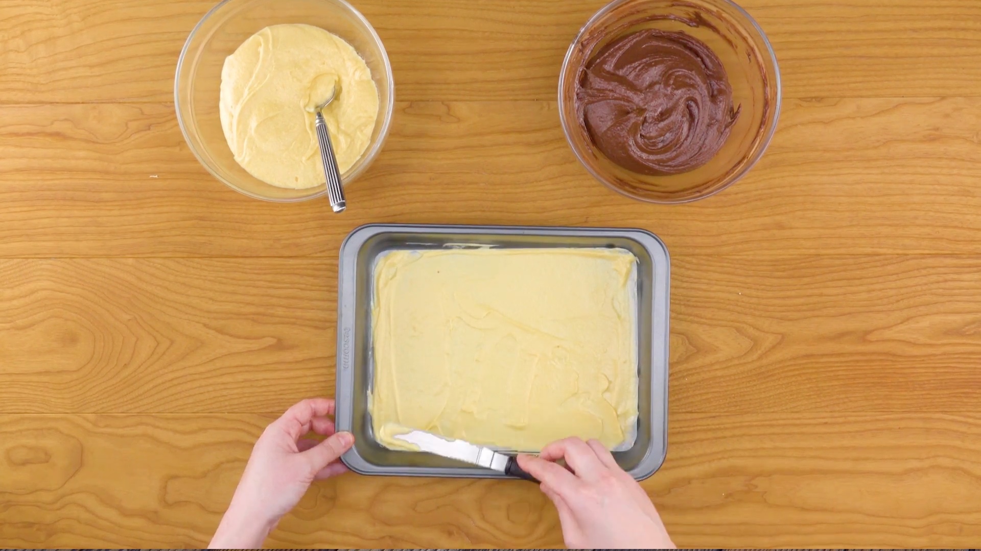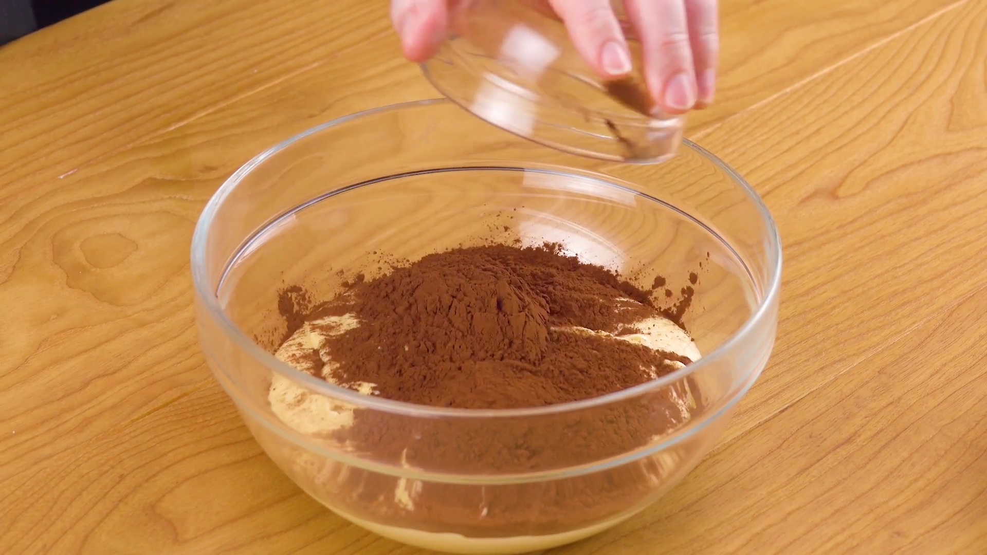 2.) Im nächsten Schritt halbierst du den Teig und hebst unter eine Hälfte zwei Esslöffel Kakao.