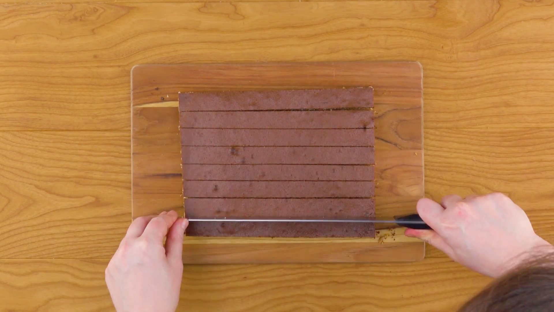 5.) Den fertig gebackenen Kuchen schneidest du in eine rechteckige Form. Achte darauf, alle Kanten genau gerade abzuschneiden. Für die nächsten Schritte ist das besonders wichtig. Nun schneide den begradigten Kuchen längs in acht Streifen gleicher Breite. Lege bei Bedarf ein Lineal an die Seiten und markiere den Kuchen an den entsprechenden Stellen, um ihn in Streifen zu schneiden.