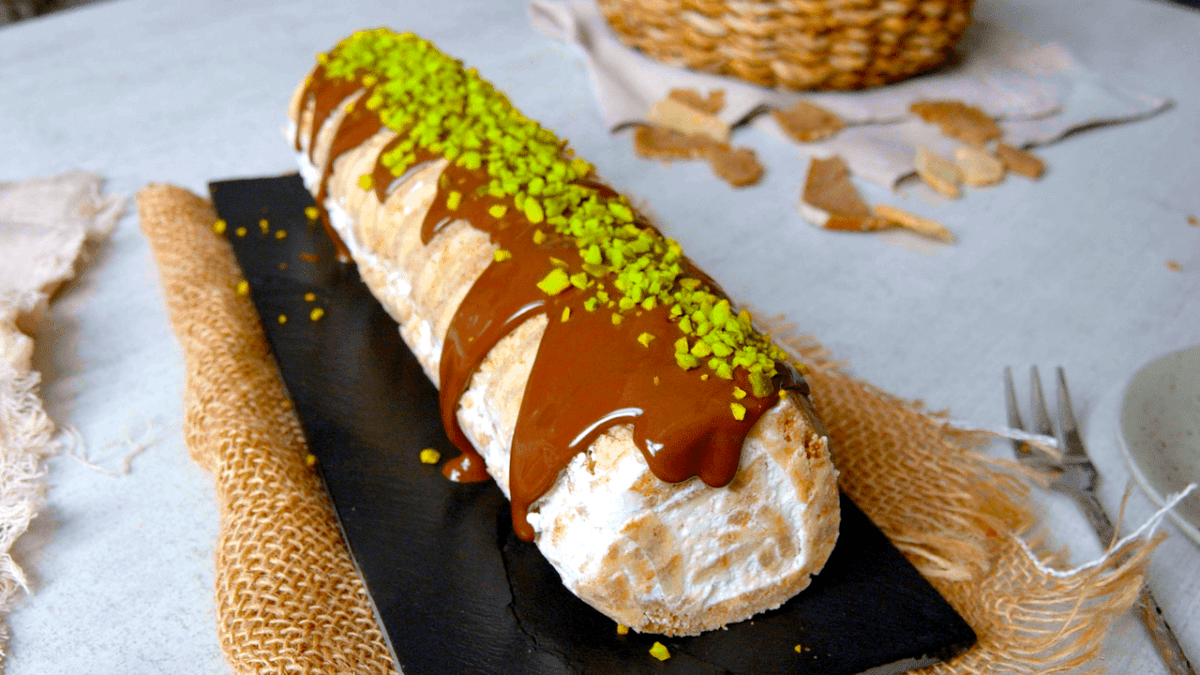 7. Übergieße die gekühlte Brotrolle mit Schokosauce und verteile darauf noch gehackte Pistazien.