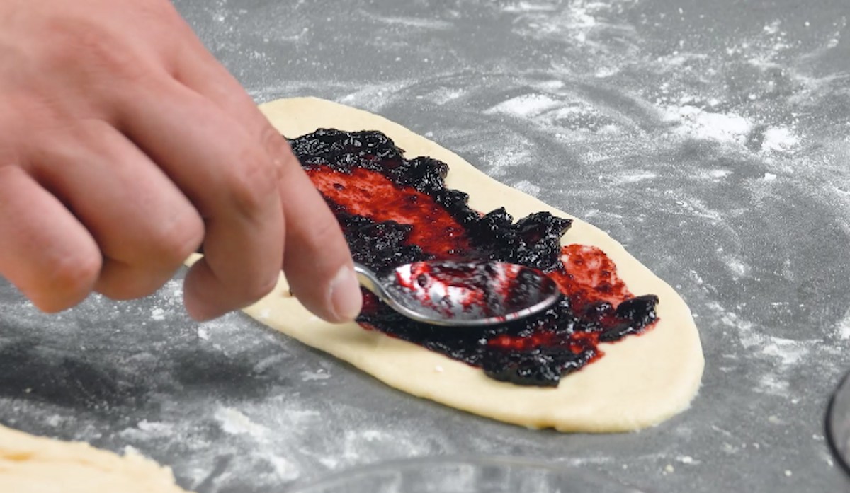 3. Bestreiche drei der ausgerollten Teigstücke mit Himbeermarmelade, drei mit Heidelbeermarmelade und drei mit karamellisierten Nüssen.