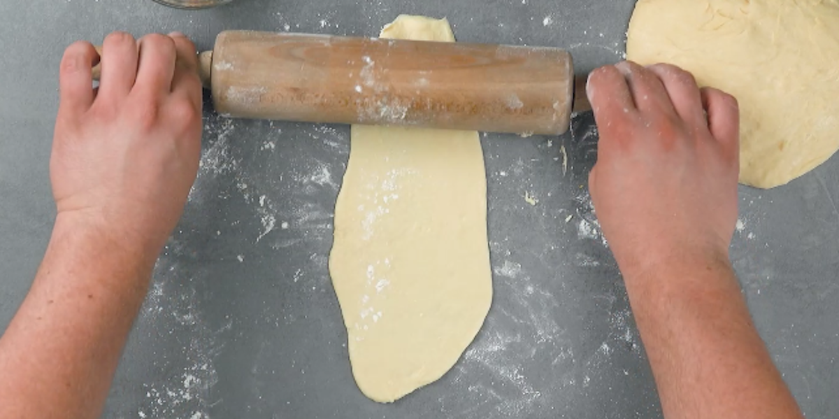 1. Gib Mehl, Milchpulver, Salz und Butter in eine Schüssel. Löse die Hefe in Milch auf, füge Zucker hinzu und gib diese Mischung zu den anderen Zutaten in die Schüssel. Gib noch ein Ei dazu und verrühre alles mit einem Handrührgerät. Lasse den Teig abgedeckt eine Stunde gehen. Teile den Teig dann in 9 gleich große Stücke und forme sie zu Kugeln. Rolle diese Kugeln mit einem Nudelholz bis auf eine Dicke von ca. 2 mm aus.