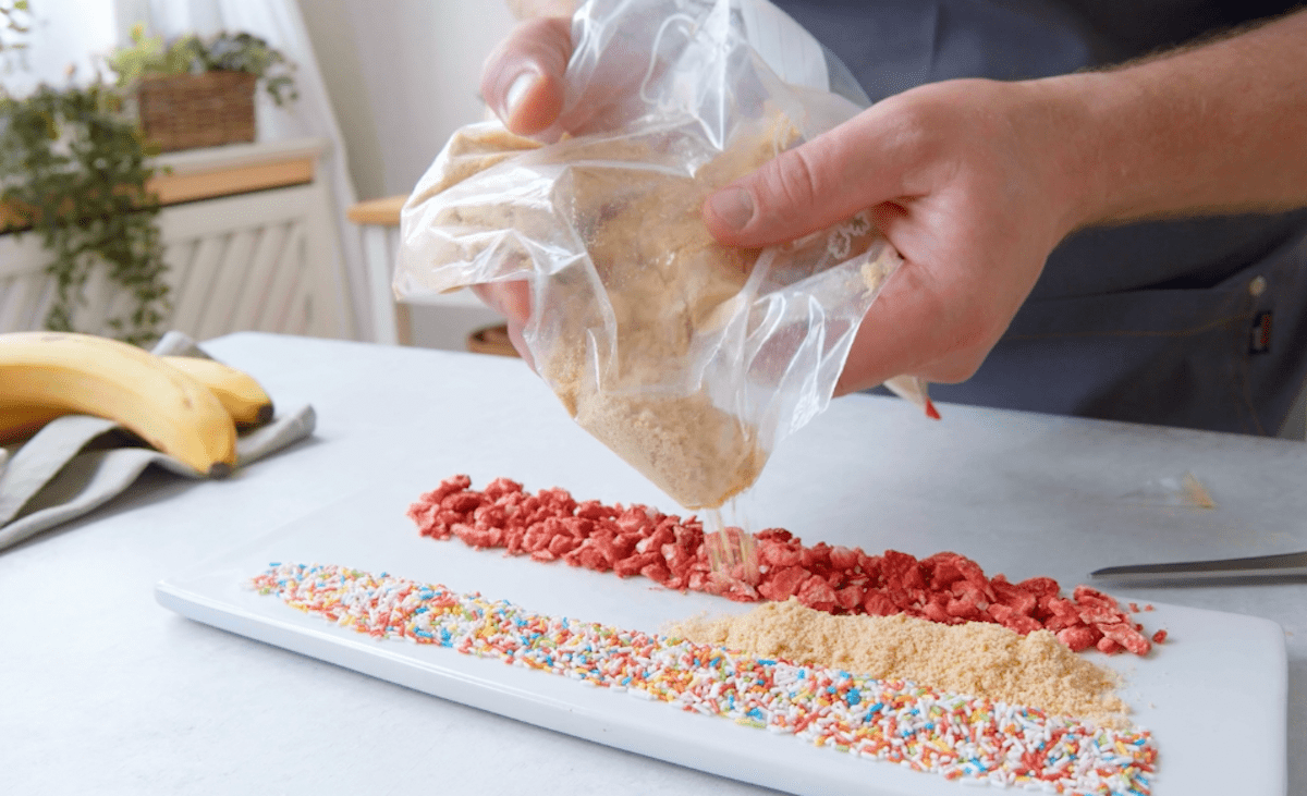 6. Fülle einen Zip-Beutel mit Butterkeksen und zerkleinere diese z.B. mithilfe einer Weinflasche. Verteile Zuckerstreusel, Kekskrümel und gefriergetrocknete Erdbeeren in Reihen untereinander auf eine rechteckige Platte bzw. Unterlage.