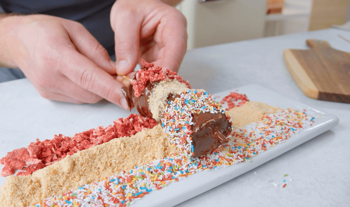 7. Rolle die beiden Spieße mit ihren Schoko-Überzügen durch die Reihen aus Zuckerstreusel, Kekskrümeln und gefriergetrockneten Erdbeeren.