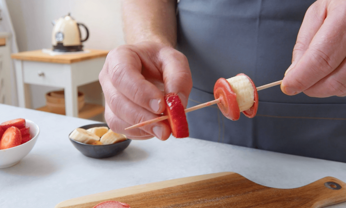 4. Schneide Bananen und Erdbeeren in Scheiben und stecke sie, abwechselnd mit den kleinen Pancakes, auf die Holzspieße.
