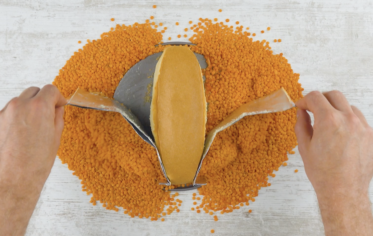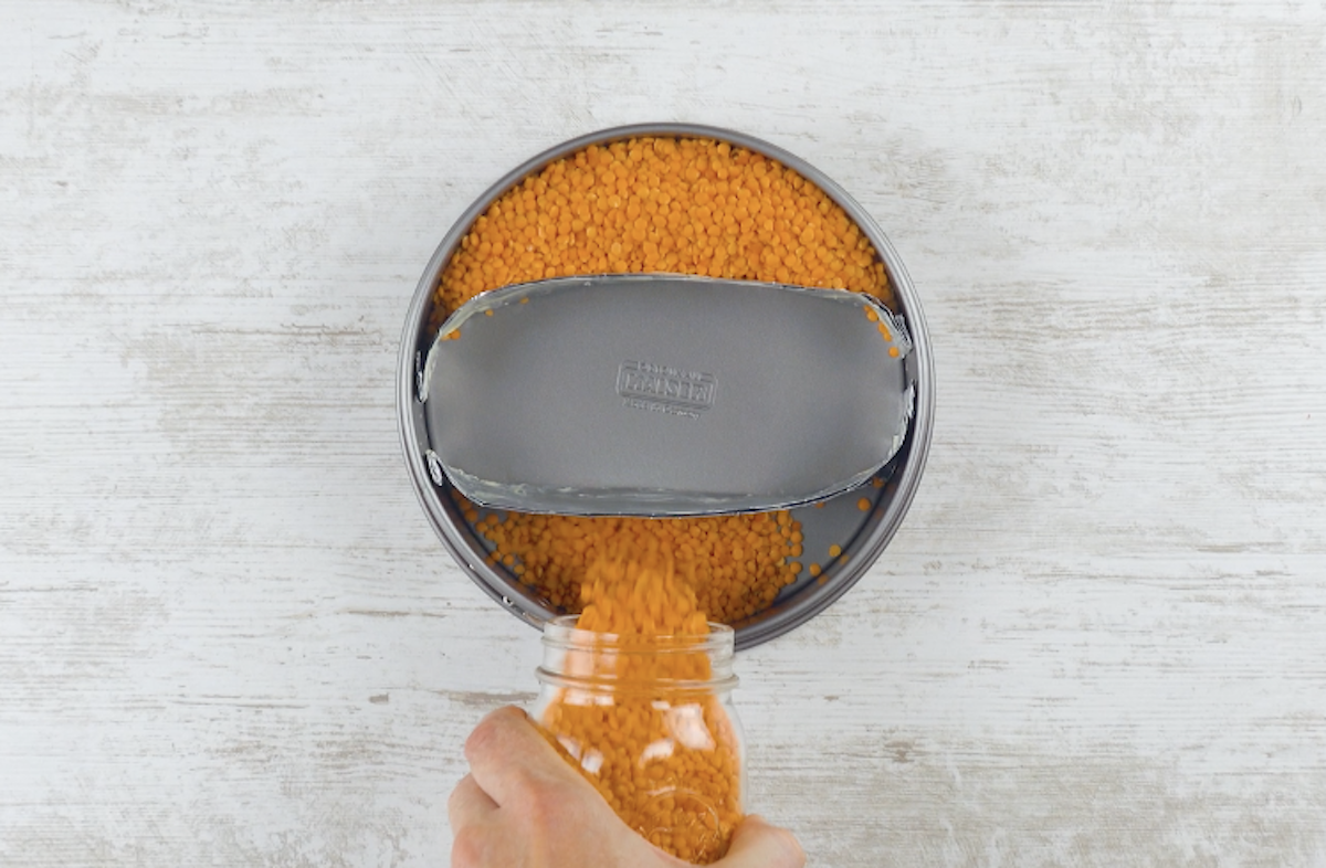 1. Buttere eine Springform und kleide sie dann mit Mehl aus. Falte aus der Alufolie zwei längliche Streifen, buttere diese ebenfalls und lege sie dann in die Mitte der Springform, sodass sie eine Hotdog-Brötchen-Form ergeben. Fülle die beiden Bereiche außerhalb dieser Form mit Erbsen oder Linsen.