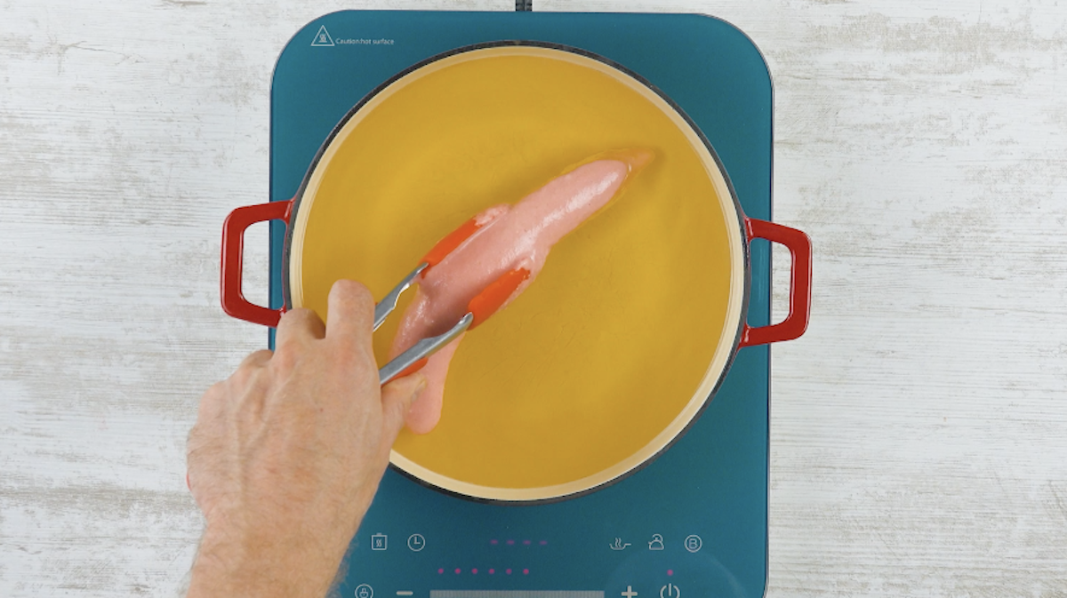 3. Vermische Mehl mit Eiern, Maismehl, Pflanzenöl, Himbeersirup und Wasser. Lasse den Ausbackteig im Kühlschrank quellen. Schäle dann die Banane und ziehe sie einmal durch den Ausbackteig. Frittiere die Banane in heißem Fett.