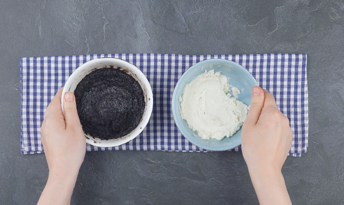 1. Trenne die Oreo-Kekse und die Vanillecreme voneinander. Sammle beide Bestandteile in separaten Schüsseln. Zerkrümle die Kekse und gib Milch hinzu. Vermenge die Masse, bis eine glatte, formbare Konsistenz entstanden ist. Die Vanillecreme rührst du ebenfalls glatt.