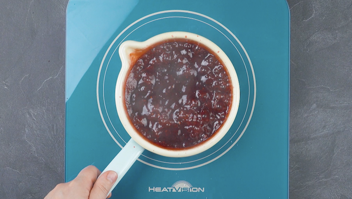 4. Gib Erdbeeren, Himbeeren, Zucker und Zitronenabrieb in einen Topf, erhitze alles unter Rühren und lass es bei geringer Hitze ca. 10 Minuten einkochen und dann abkühlen.