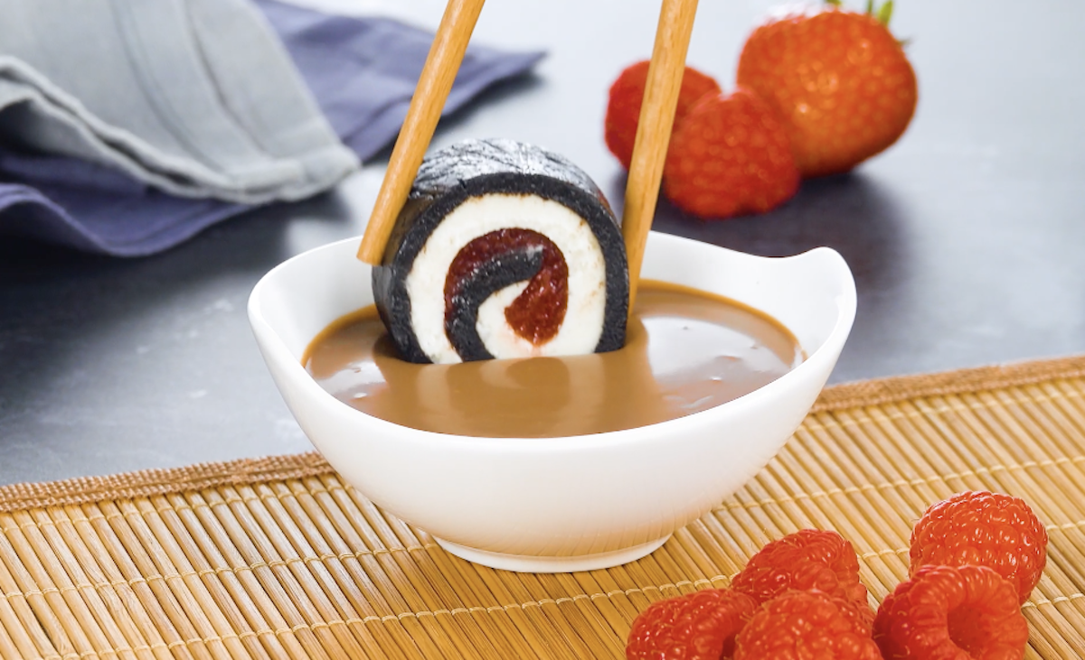 6. Die süße „Sojasoße“ wird folgendermaßen hergestellt: Gieße heiße Sahne auf kleingehackte Schokolade und verrühre alles miteinander, bis sich die Schokolade komplett aufgelöst hat. Schneide dann die Sushirolle in Scheiben und serviere sie mit der Soße.